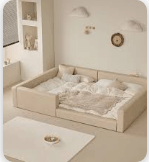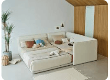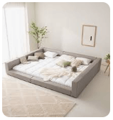 어린 자녀와 함께 자는 경우 패밀리 침대가 정답입니다. 보통 퀸(Q)과 슈퍼싱글(SS) 매트리스를 붙여서 사용하며, 나중에 아이가 자라면 분리해서 각자의 방에 놓아줄 수 있다는 실용적인 장점이 있습니다.